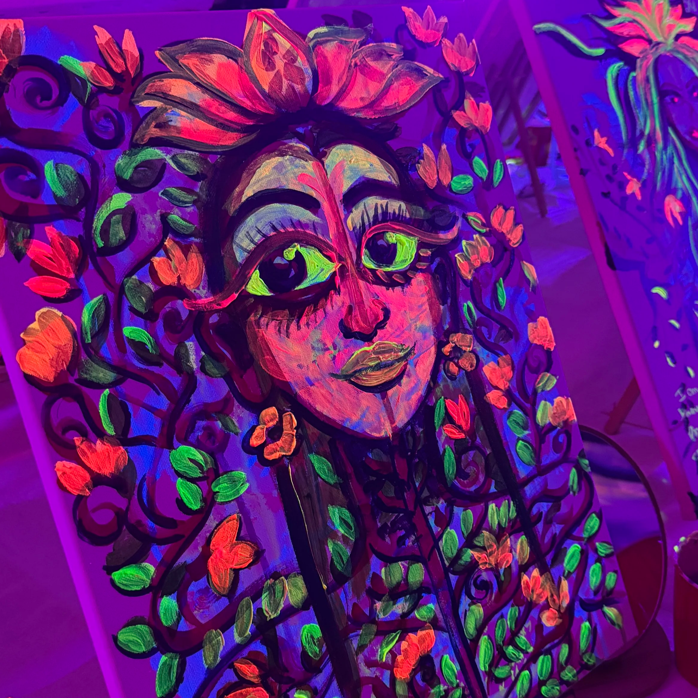 Memories from Neo-Selfie: An Expressive Self-Portrait Workshop. A creative self-love experience. Guided meditation meets intuitive painting using neon paint!